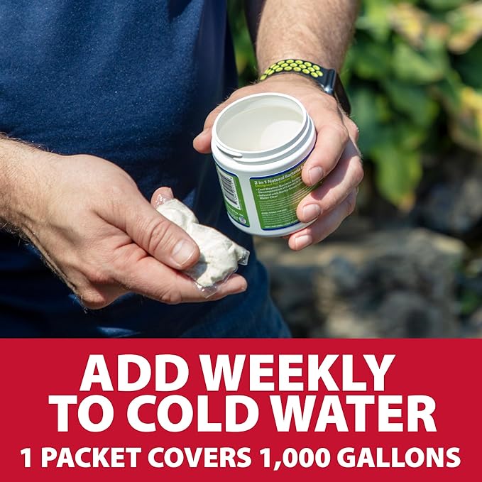 - Infused With Barley Straw to Keep Water Clear -- The activated barley combats common water quality issues and improves water clarity. Apply once a week. One packet treats up to a 1,000 gallon pond.
