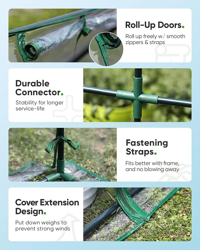 - KEEP THE GROUND NICE AND WARM - This has about a 95% germination rate instead of the usual 80% due to the nice ground warmth! Equipped with 2 doors and 4 zippers, the greenhouse can be completely closed to keep warm in winter.