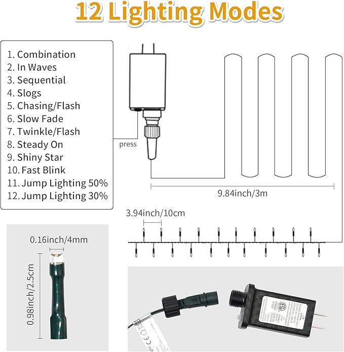 - 【Plug in Twelve Modes Controller】12 Light patterns changing with one control button like combination, in waves, sequential, slogs , shiny star, chasing/flash, slow fade, twinkle/flash, steady on, FAST BLINK, JUMP LIGHTING 50%, JUMP LIGHTING 30%.