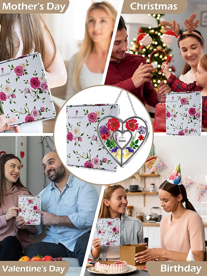 KY&BOSAM Heart Suncatchers Grandma Gift Ornament Stained Glass Sun Catcher Garden hangings Windows with Pressed Flower Heart Embedded in Glass Gifts for Grandma Mother`s Day Birthday Gifts