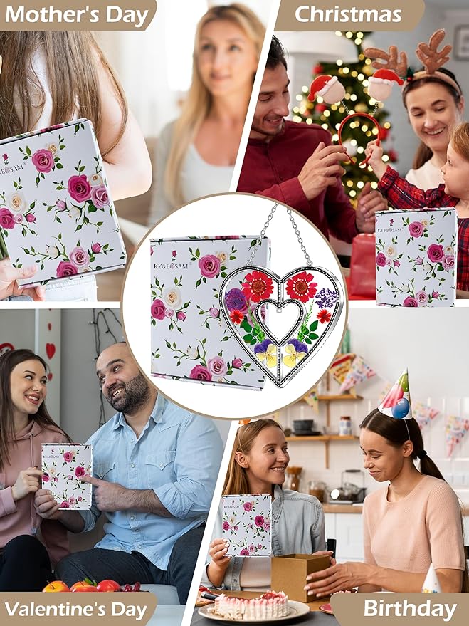 KY&BOSAM Heart Suncatchers DIY Stained Glass Hangings for Windows Wind Chimes Home Gardner Decor with Pressed Real Flowers Heart No Charm Birthday Gifts for Women Mother`s Day Christmas Ornamets