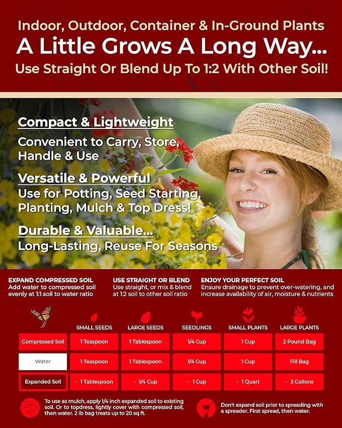 - EASY to USE - Just add water 1:1 to compressed soil to expand up to 4X. Use 1 tsp for small seeds, 1 tbsp for large seeds, 1/4 cup per seedling, 1 cup per small plant, and 4 cups per gallon plant. Use expanded soil straight or blend 1:2 with other soil. Prevents overwatering, re-wets easily, and stays moist 3X longer. As mulch or top dress, apply 1/4 inch expanded soil or spread compressed soil and water. A 2 lb bag covers up to 20 sq ft.