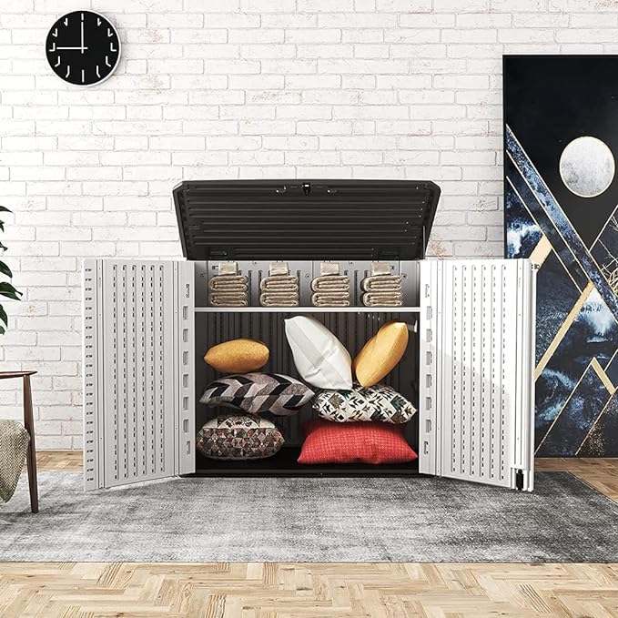 - ★ PERFECT FOR STORAGE — The outdoor storage cabinet could place all kinds of tools, sundries, trash cans etc.Meanwhile, it suitable for all kinds of occasions: indoor, outdoor,balcony, yard, garden, street, etc.