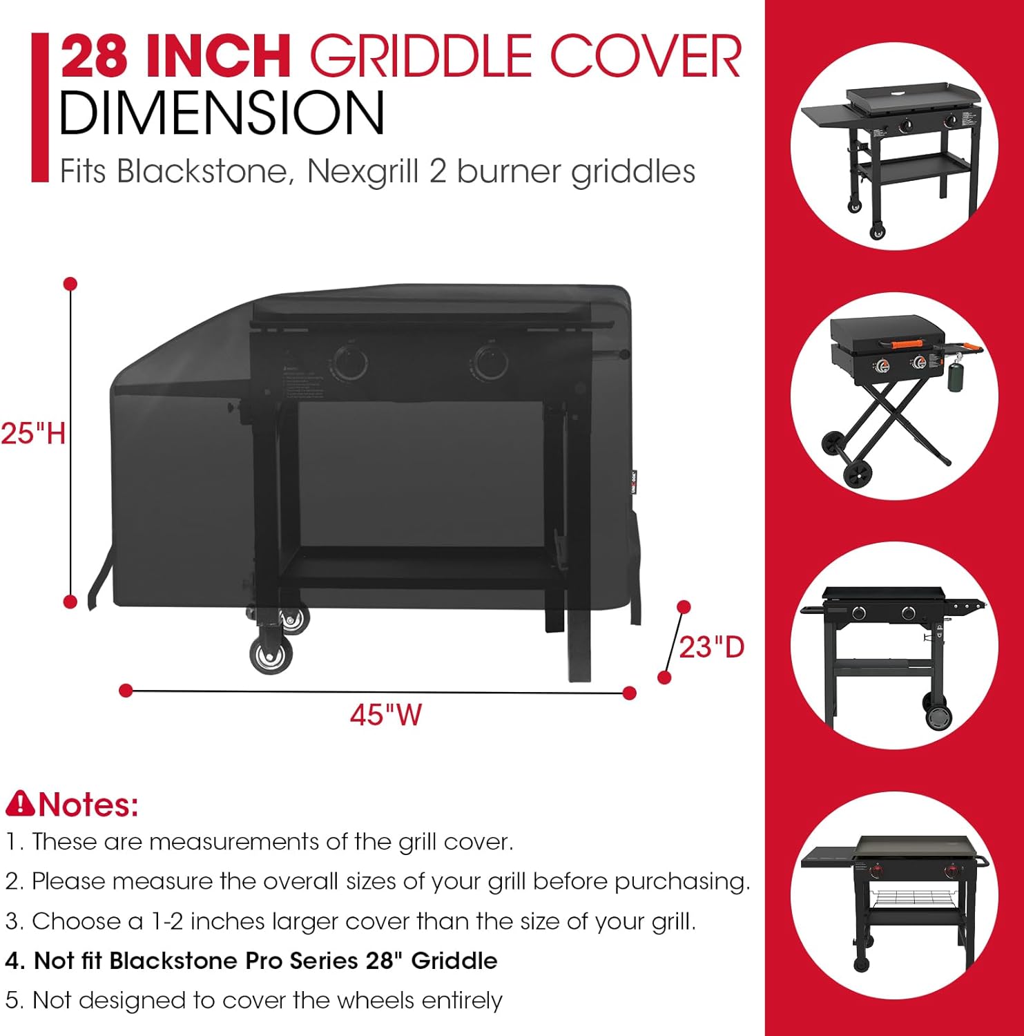 - 28 Inch Griddle Cover Dimensions: measures 45"W x 23"D x 25"H, compatible for most brands grill like Blackstone 28 inch griddle with one side shelf, Nexgrill and other griddles with similar size. NOT fit Blackstone 28 ProSeries griddle or models with counter/griddle height shelves such as 1856. Please measure your griddle before purchasing