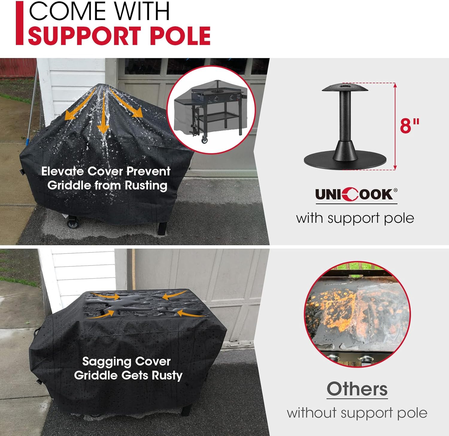 - Support Pole Make a Difference: A support pole is included to raise the center of the griddle cover to prevent water pooling and debris accumulating, and also prevent the cover from sitting directly on the oiled surface of your griddle, keeping your grill dry and clean in any weather