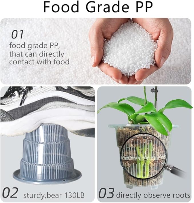 - Excellent Ventilation and Drainage,Avoid Root Getting Bad: 360ยฐ ventilation holes around the transparent orchid pot provide excellent ventilation and drainage,avoid root getting bad; the raised centre of the clear orchid pot, is our Patent โAir Cone",greatly increase the ventilation area of central part of roots;air cone also have grooves and holes, also develop more strong lateral roots inside the clear orchid pots.The bottom of outer pot also has ventilation holes to form good air circulation.