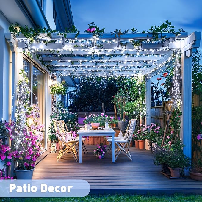 - 【Garden & Tree Decorations】 Apparently, our solar tree lights and garden & tree do go together. During Christmas, your garden will magically transform into a wonderland that is decorated with solar Christmas lights. You also can put these solar outdoor lights on the back fence, tree trunks, bush, etc. And it made your backyard very charming at Christmas. What's more, in the dark, the wire fades invisible, leaving only the bright lights, creating a classy and romantic atmosphere.