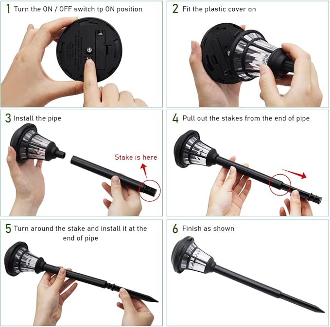 - NO WIRES. Push the stake into the soil, it just takes a few seconds. When you receive solar lights, please turn the switch to ON position under the light cap then place the light cover upside down at the table to check whether the lights will light up or not.