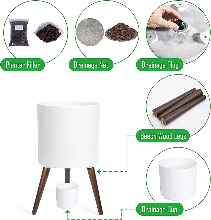 - What’s included: planter pot with drainage hole, set of stand – 3 solid wooden legs.