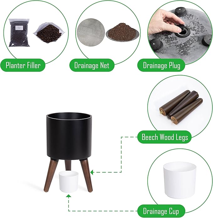 - What’s included: planter pot with drainage hole, set of stand – 3 solid wooden legs.