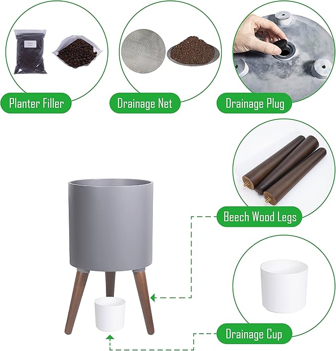 - What’s included: planter pot with drainage hole, set of stand – 3 solid wooden legs.