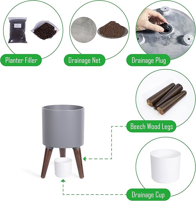 - What’s included: planter pot with drainage hole, set of stand – 3 solid wooden legs.
