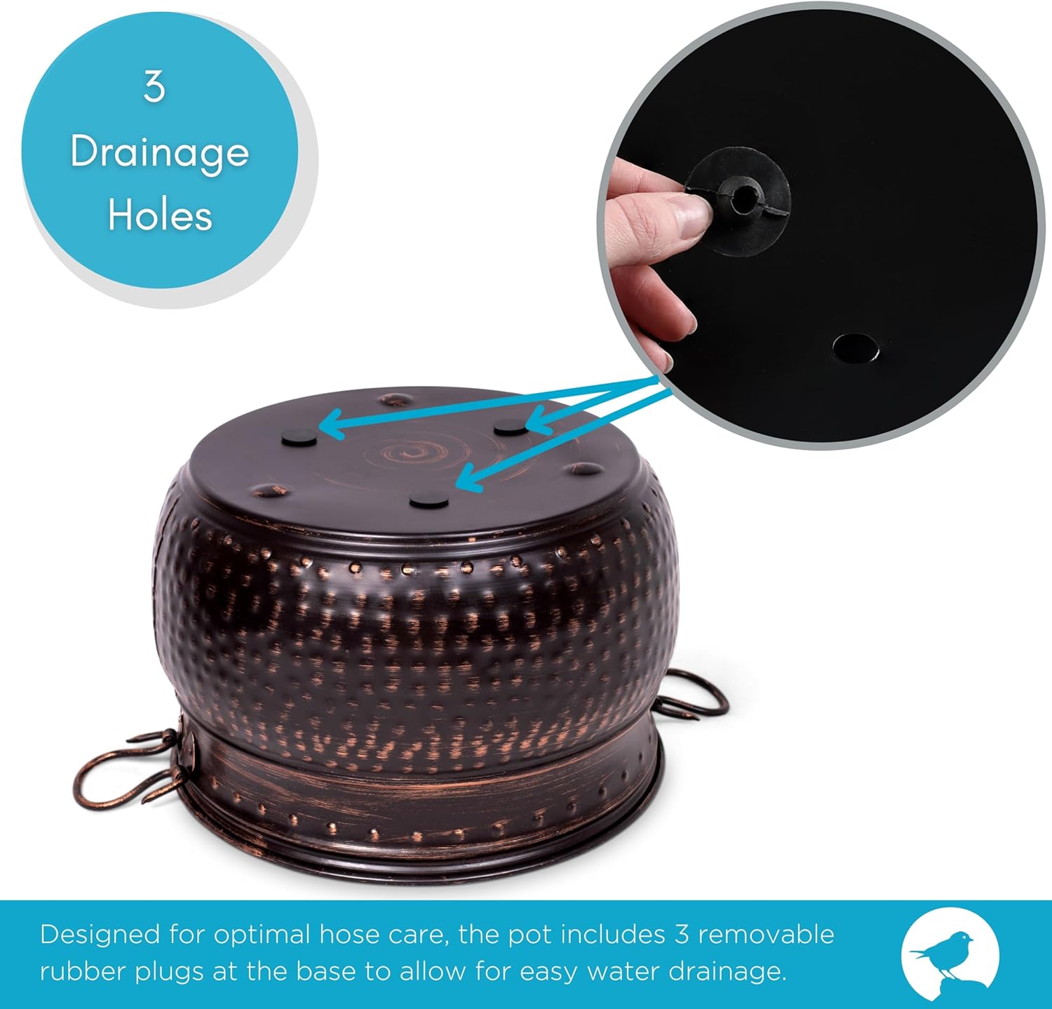 BirdRock Home Water Hose Holder - Decorative Metal Pot, Indoor or Outdoor, Garden Storage Organizer, Patio Portable Bucket - Distressed Bronze, Holds up to 200ft Hoses, Large with Lid