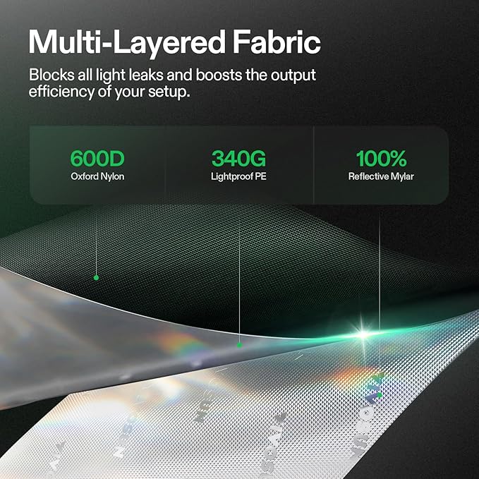 - Keeps All Light Inside: The Hydroponic Mylar Grow Tent is made of high-quality 600D Oxford canvas that is lined with reinforced PE layer and 100%-reflective mylar walls, which can effectively block all light from leaking and boost the output efficiency of your setup; The zipper part has also upgraded with the black inner lining to prevent light into the tent; There is no need for additional flaps or tape, you can just zip up to create a lightproof seal environment