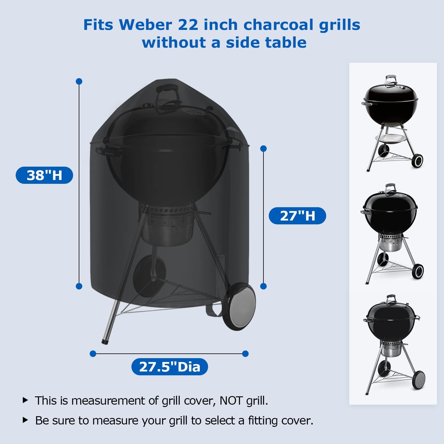 - ► Dimensions - Measures 27.5”Dia x 38”H. Designed to compatible for most popular brands grill like Weber 22 Inch charcoal grills without a side table, Big Green Egg BGE, Char-Broil, Kingsford grills and more grills up to 26” Dia at the widest point. Does NOT fit smokey mountain cooker. Please measure your grill before purchasing.