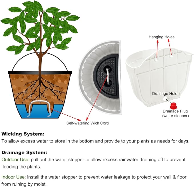 - Wicking System & Drainage System: Wall Hanging planter pots with drainage mesh to allow excess water to store in the bottom of this lazy wall flower pot and provide to your plants as needed to ensure plants take enough water they need for days, and you don't have to water them frequently. This wall hanging planter pots help you care your plants when you go outside a couple days or on business. The drainage hole of the wall planter drains off excess rainwater when used outdoor