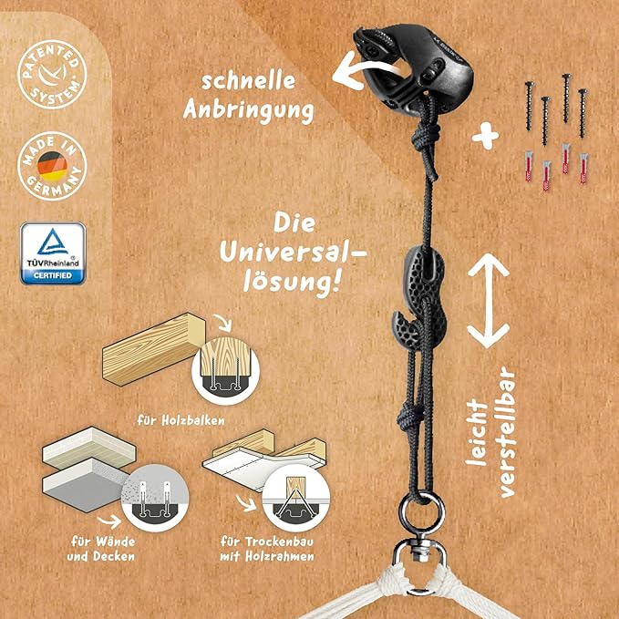 - VERSATILE WALL SUSPENSION: Our hammock chair comes with a suspension kit, making it suitable for beams wider 3.5 inches, ceilings with wooden studs, and solid masonry. Easy to install with our patented MultiSpot’s four-screw mounting system to keep your hammock chair locked in place and our patented SmartHook for hassle-free height adjustment.