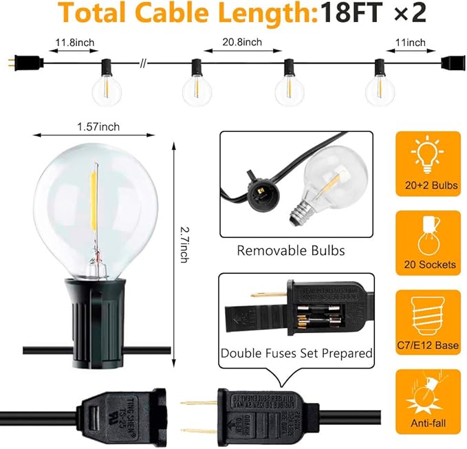 - 【2Pack 18FT G40 Globe String Lights】This outdoor led string lights totally with 20 sockets(E12 Base),22 plastic clear G40 Bulbs( 2 spare),Shatterproof,save over 90% energy over incandescent bulbs.The 2700K soft warm string lights is perfect for creating romantic atmosphere for wedding, warm family reunion,party and etc.