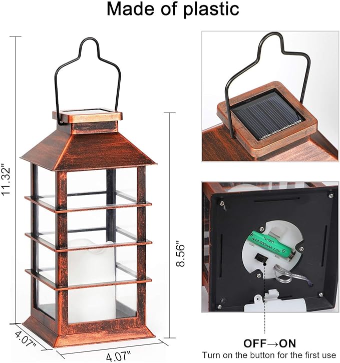 - ❤ Easy to use ❤ This solar lanterns outdoor does not require installation or additional wiring, just turn on the bottom switch, place it in direct sunlight during the day, and place it away from the light source at night. The garden hanging lights can be used in yards, roads, driveways, shelves, tables, bars, photo booths, terraces, porches, etc.