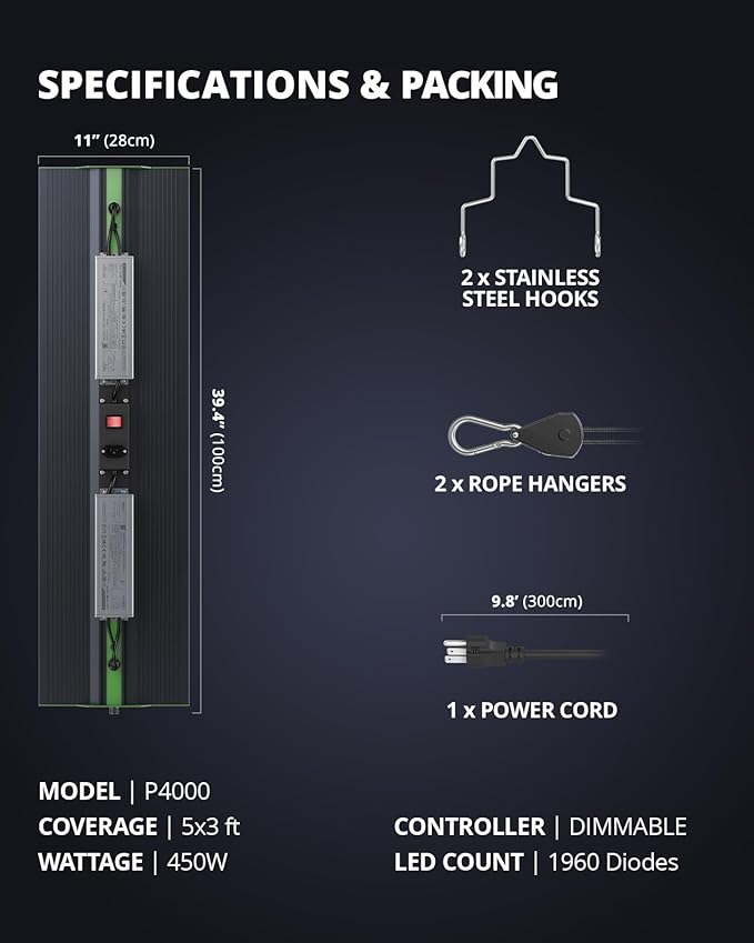 - LOWER OPERATION COST & DIMMER FUNCTION: VIPARSPECTRA P4000 LED grow light has adopted the newest SMD LED Technology to provide high PAR output, high energy efficiency and long lifespan while improving light penetration. An added dimmer knob is featured to manipulate the brightness level of the entire light, allowing flexibility to obtain perfect growth performance for each growing phase.