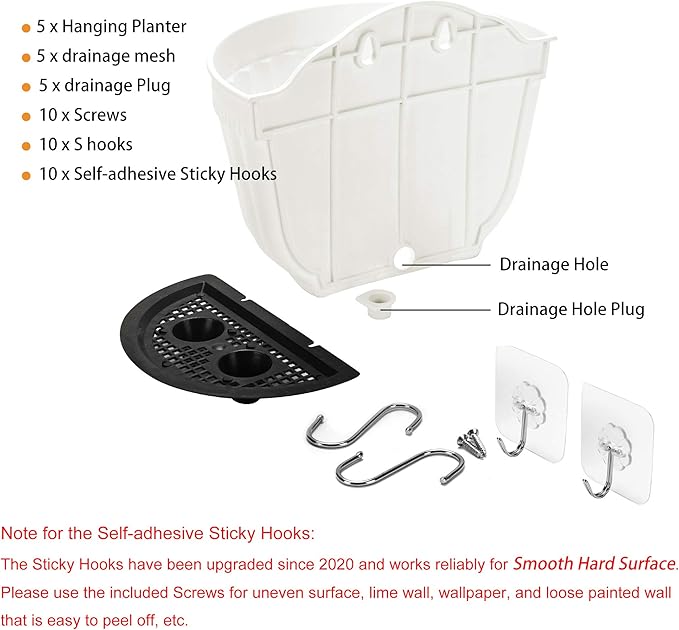 - INDOOR & OUTDOOR USE: vertical wall hanging planter made of high quality durable PP resin material, safe and non-toxic, this polypropylene resin planter is a tough, lightweight , all-weather durability with UV protection for outdoor use, an alternative to clay or ceramic planters. Install drainage plug when used indoors. SIZE (L*W*H): 8.1"x4.7"x6.8"; 10 x screw of stainless steel, 10 x S hook of stainless steel,10 x self-adhesive command wall hook included.