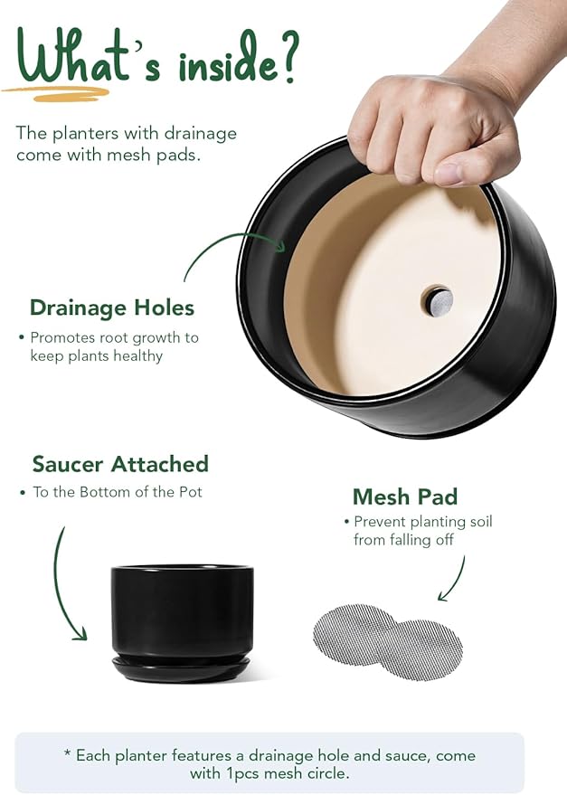 - Pots With Drainage Hole & Drip Pans & Drainage Net: The hold in the bottom allows the excess water to exit out of the soil when you’re watering the plant; The drainage plates are attached to the bottom of the pots and do not come off; Drainage Net is included, which is designed to prevent planting soil from falling off (Plant is not Included)