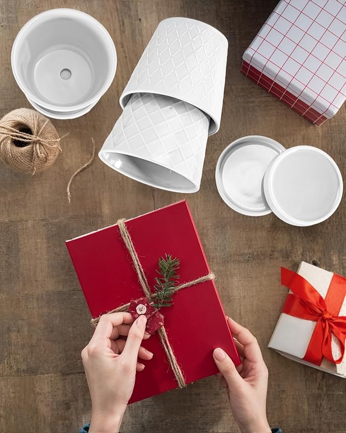 - Unmatched Quality - Crafted from durable ceramic made of kaolin, our flower pots boast superior quality and resilience. Each planter includes a drainage hole at the bottom to minimize water run-off, promoting healthier plant growth. Say goodbye to stagnant water with the additional drill hole, ensuring optimal plant health. Plus, the ceramic saucer adds convenience for indoor display