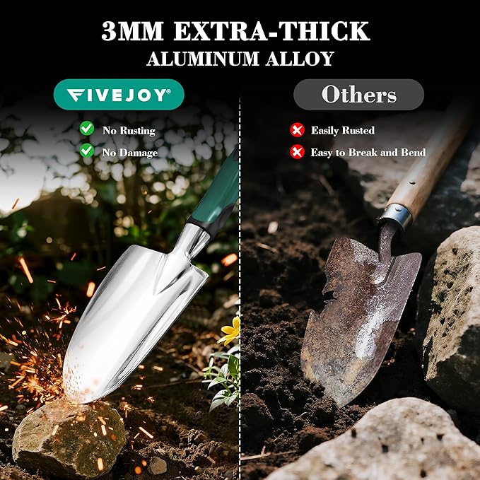 - 3MM-THICK ALUMINUM GARDEN TOOLS: These seven hand tools are made from reinforced 3mm-thick cast-aluminum, offering enhanced strength and durability for all your gardening tasks. They are treated with ultra-fine polishing technology to ensure exceptional corrosion resistance, making them tough, sharp, and long-lasting. Each tool also features a handy hanging hole on the handle for easy storage.