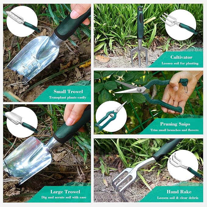 - ERGONOMIC HANDLE TOOLS: Each tool has an ergonomically made soft handle, fashioned from high-quality TRP, that fits comfortably in small and large hands, on top of that, theyโre intuitively designed to provide plenty of leverage and save you effort and strain when planting, weeding, and digging. If you prefer to use your hands, wear the digging claw gardening gloves to plant, weed, and rose prune โ without needing other tools for easy storage.