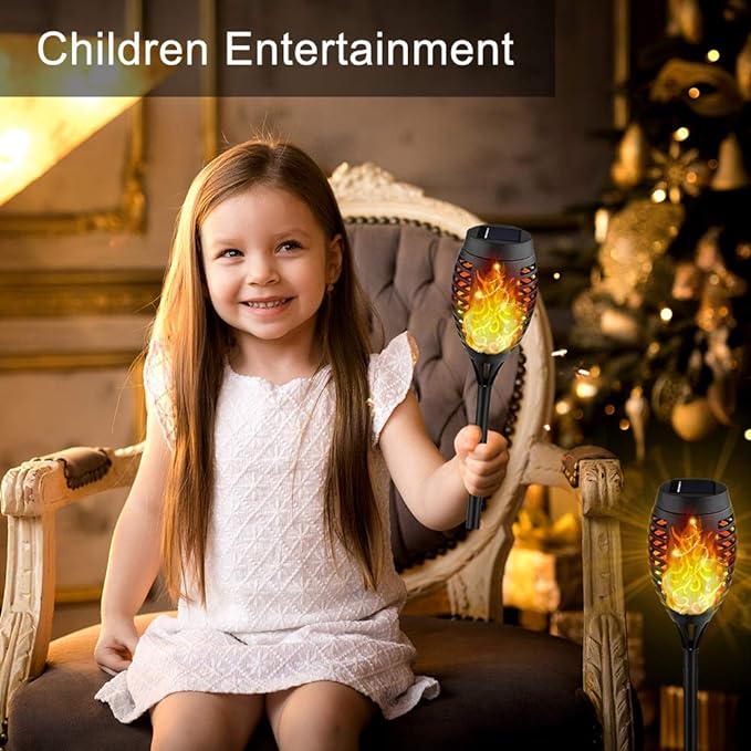 • Torch Lights Flickering Flame: Solar outdoor lights flicker a soft and mod-enhancing "Real" flame for outdoor decorations for patio, garden, yard, porch, pool decor and for party, camping, barbecue, wedding, christmas, halloween decor.