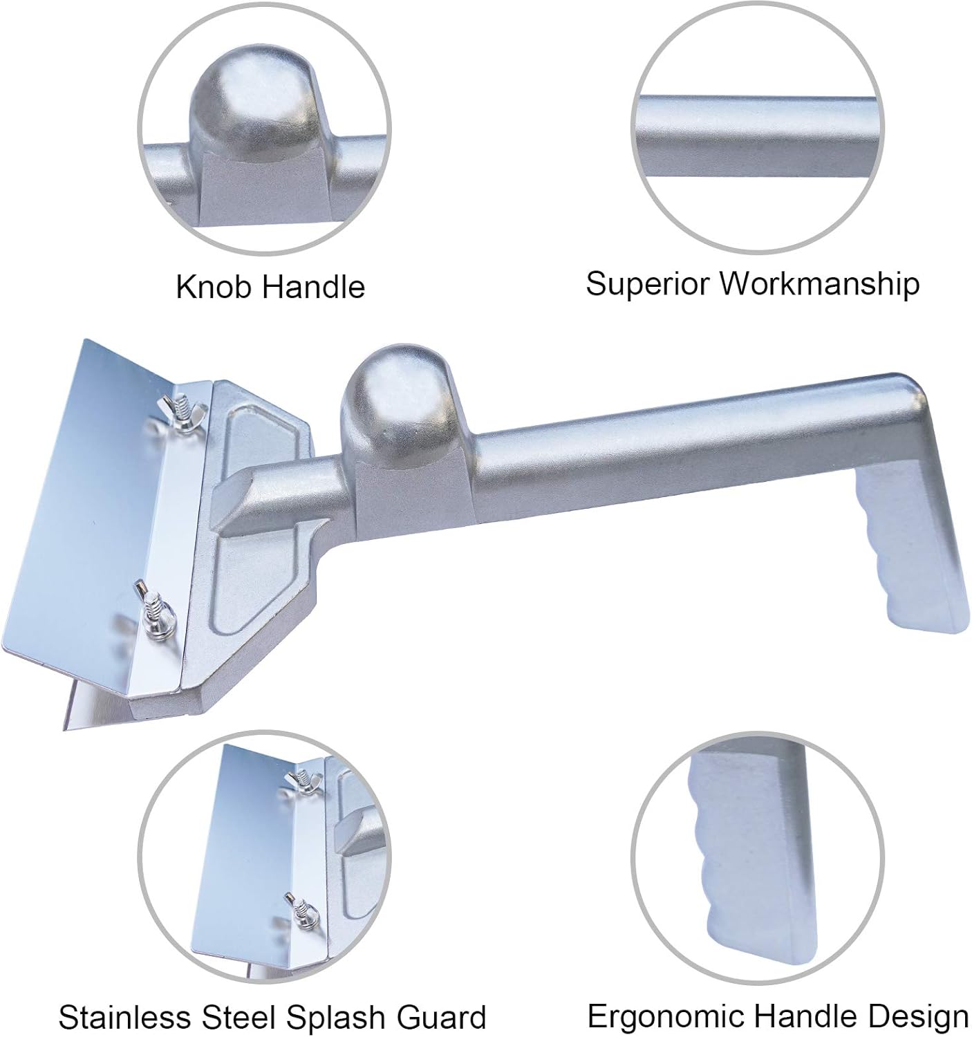 - Ergonomic Design: The long handle of the large grill scraper provides more leverage and prevents burns on hands and fingers. A raised knob grip near the front can help you give more control and pressure. The splash guard prevents residue from splashing upward during cleaning and keeps oil and debris off your hands