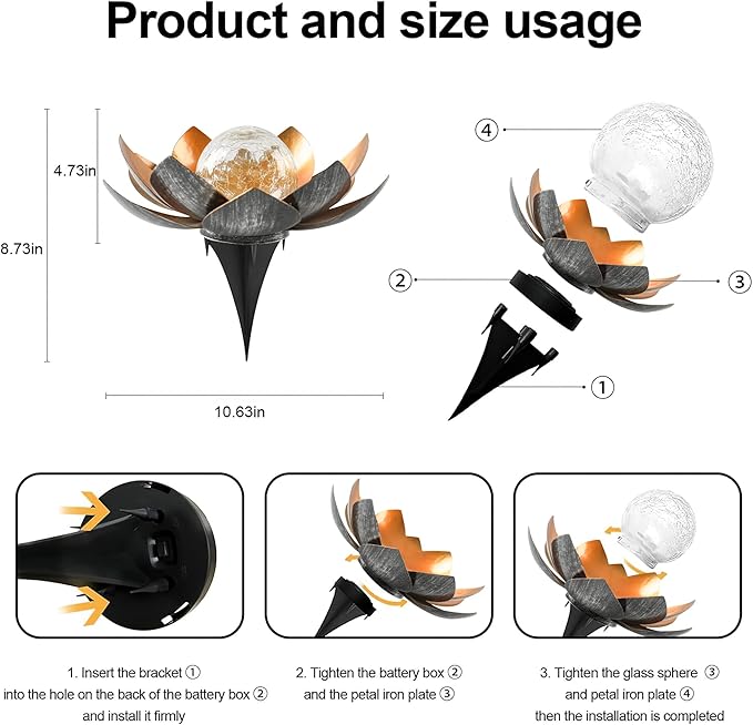 - [Wide usage scenarios] Lotus solar lights can decorate your garden, courtyard, terrace, outdoor tabletop, swimming pool, lawn, aisle and other places you like to decorate. Especially suitable for weddings, parties, birthdays, holidays,Camping,anniversaries, Valentine's Day, Christmasand other occasions