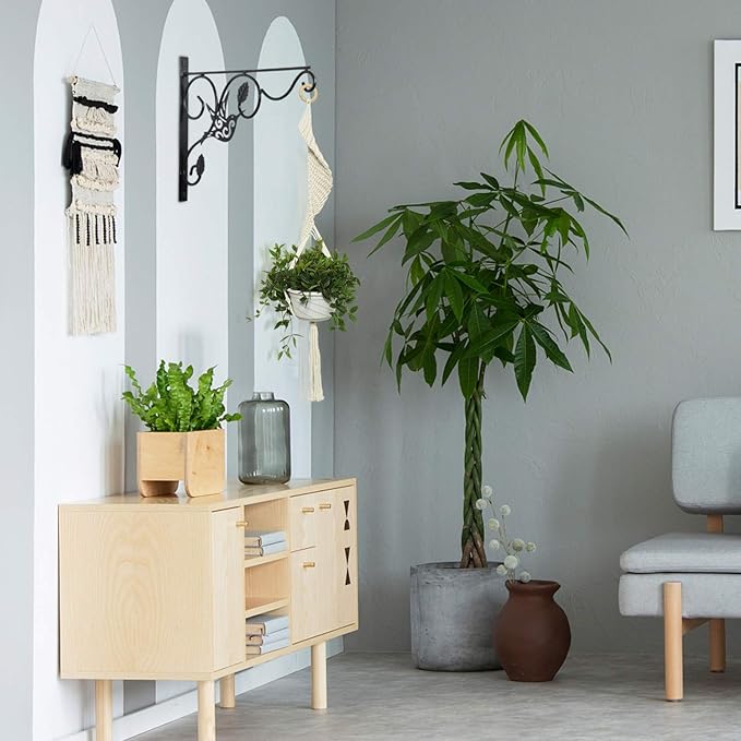 - Decorative Hook Set: Each set contains two black hooks, 4 screws and rubber plugs. The size of plant hook is 13 inches long x 9.8 inches high. The hanging hook is very stable and firm, and more practical than other plant hooks on the market