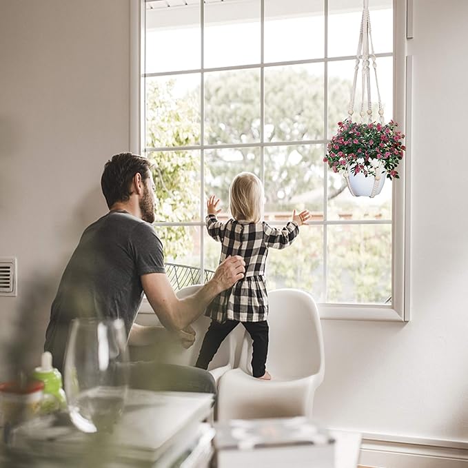 - Great Decor: The macrame hanger is suitable for living room,bed room,ceiling,bathroom,plant hanger also the perfect decoration for yard,porch,plant corner,office and apartment.This hanging plant holder will meet your indoor and outdoor decoration needs,help you save more space and avoid naughty pets and children from breaking the flower pot.Show your plants some love with this modern, vintage-inspired macrame plant holders,bring depth to your Boho plant hangers indoor macrame dรฉcor