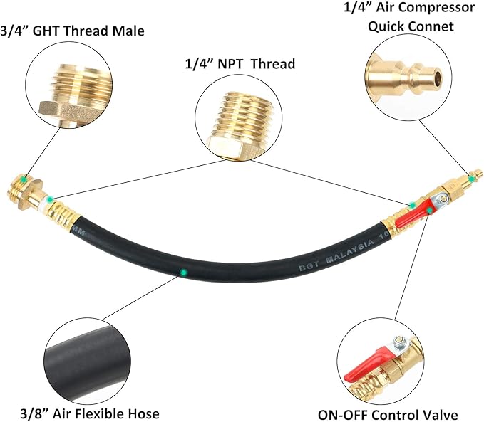 - FLEXIBLE HOSE ENSURES PRACTICALITY AND SAFETY - The pre-assembled length of this hose is about 12 inches, while its width is about 17mm. The hose can be bent 360ยฐ without any kink and easily access to all the tight spaces. With this flexible hose, you can not only easily connect the Air Compressor and the garden faucet, but also reduce the stress on the pipes and fittings when working, ensuring safety and long-term usage.