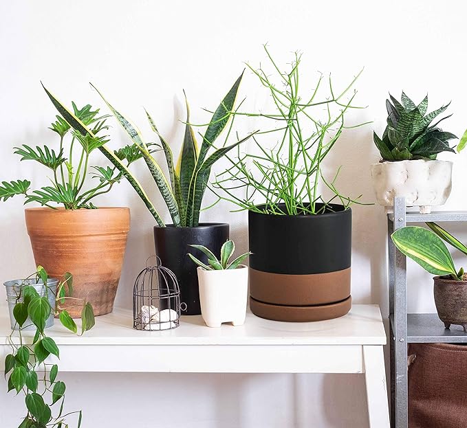 D'vine Dev Set of 2 Plants Pots, 6 Inch Ceramic Planter Pot for Plants with Drainage Hole and Saucer, Black/Speckled Tan, 94-V-C-7