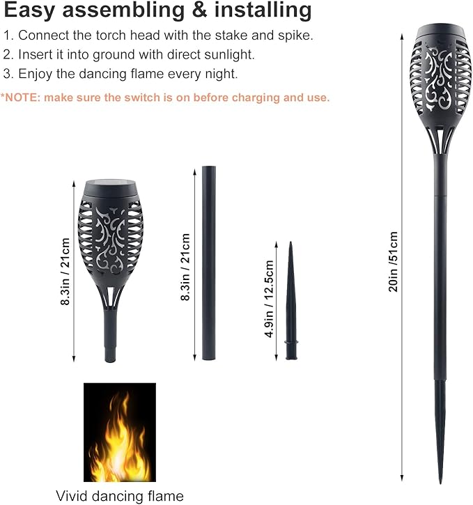 - MAKE YOUR NEIGHBORS JEALOUS: The solar flame lights are a must-have for any gardens that is under the full sun during the day. It is so unique and it will add a special touch for your yard at night and after sunset. Get your solar flame torch lights today.