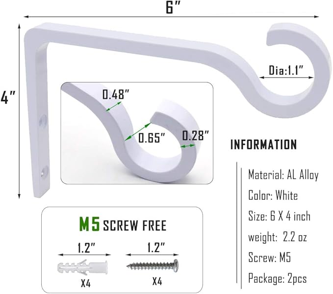 - 【EASY TO INSTALL】This package includes 2 plant hooks, 4 screws and 4 wall anchors, and maximum load up to 22 lb. Each screw is a standard M5 screw, 1.2 inches long. All you have to do is screw the screws into the wooden fence posts, deck posts and even the interior walls. It looks great in a variety of different environments.