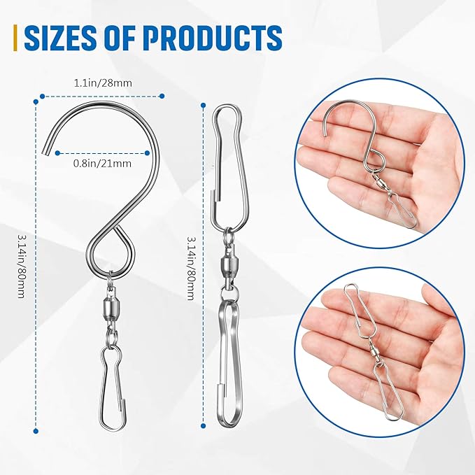 - Suitable occasion: these stainless steel hanger swivel clips are suitable for hanging the ornament that can rotate, such as windmills, crystal winders, billboards, retail products, display flags, windsocks, flower pots, plants, bird feeders, solar lights, Christmas lights, etc., to adorn your party, entertainment, holiday and festival more romantic