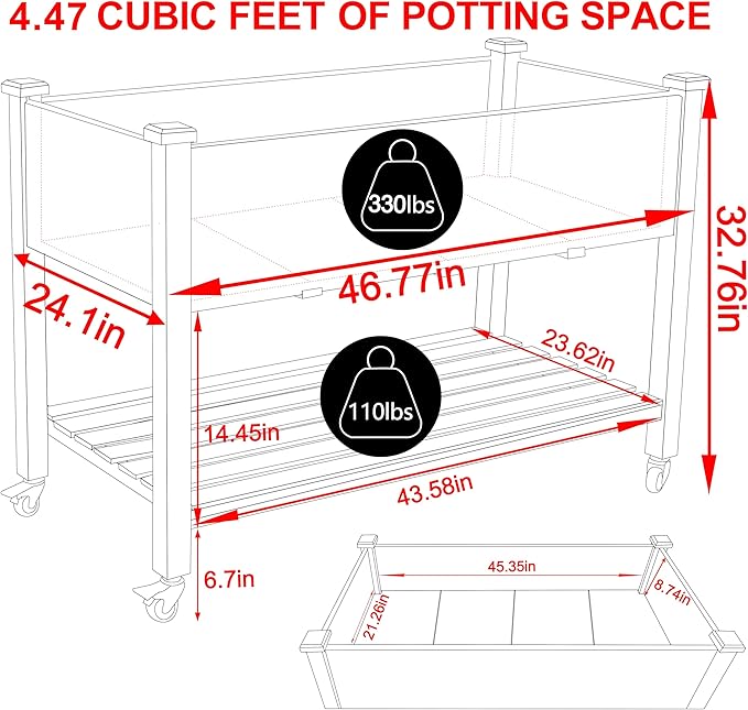 - DIMENSION - The overall size of raise garden bed: 46.77''W x 24.1''D x 32.7''H. The depth of raised garden bed: 8.74''. The height of legs:21.15''. The height from shelf to ground: 6.7''. The height from shelf to the raised garden bed: 14.45''. The weight capacity of raised garden bed: 330lbs. The weight capacity of shelf: 110lbs. The maximum potting space capacity: 4.47 cubic feet.