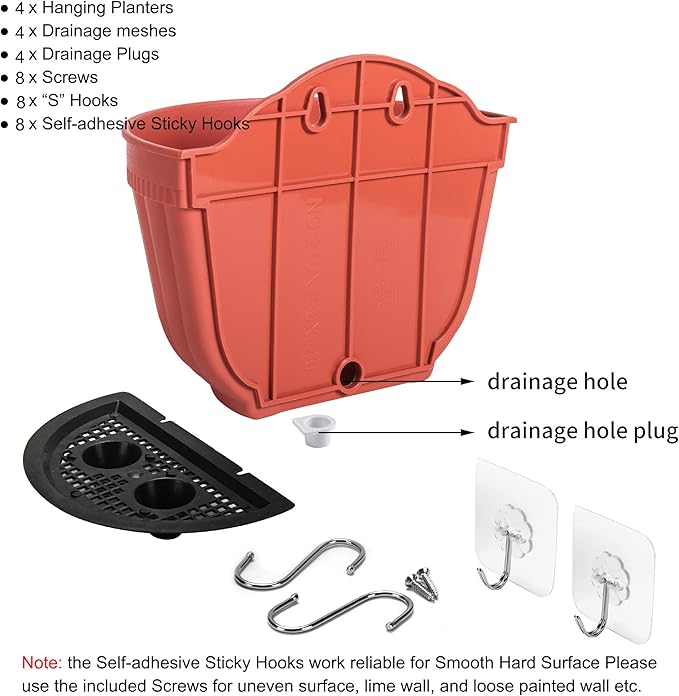 - Indoor and Outdoor Use: Vertical wall hanging planter made of high quality durable PP resin material, safe and non-toxic, this polypropylene resin planter is a tough, lightweight , all-weather durability with UV protection for outdoor use, an alternative to clay or ceramic planters. Pull out drainage plug to allow for the removal of excess rainwater when installed outdoors. Install drainage plug when used indoors. SIZE (L*W*H): 8.1"x4.7"x6.8"; 4 x โSโ hooks of stainless steel included.