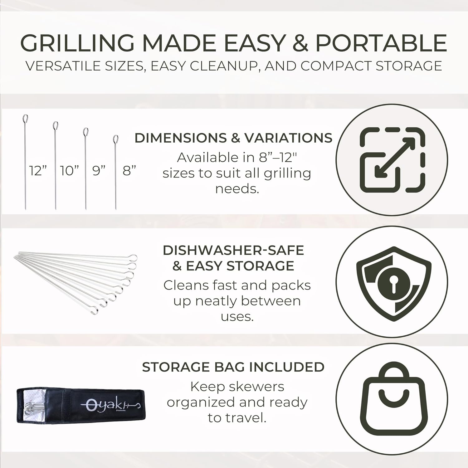 - DISHWASHER-SAFE & CONVENIENT STORAGE BAG INCLUDED: Save time cleaning up with O-Yaki’s dishwasher safe skewers. The included storage bag makes these flat metal skewers easy to store and transport, suitable for outdoor adventures like camping, tailgating, or backyard BBQs.
