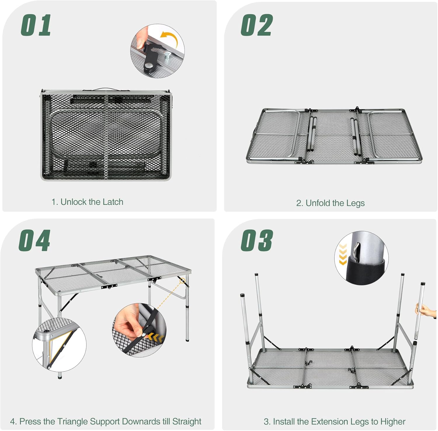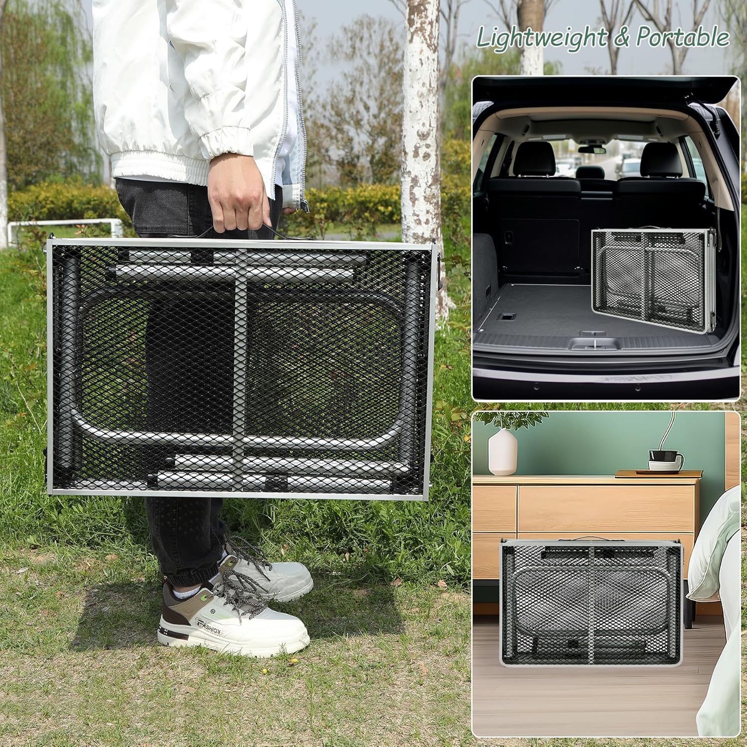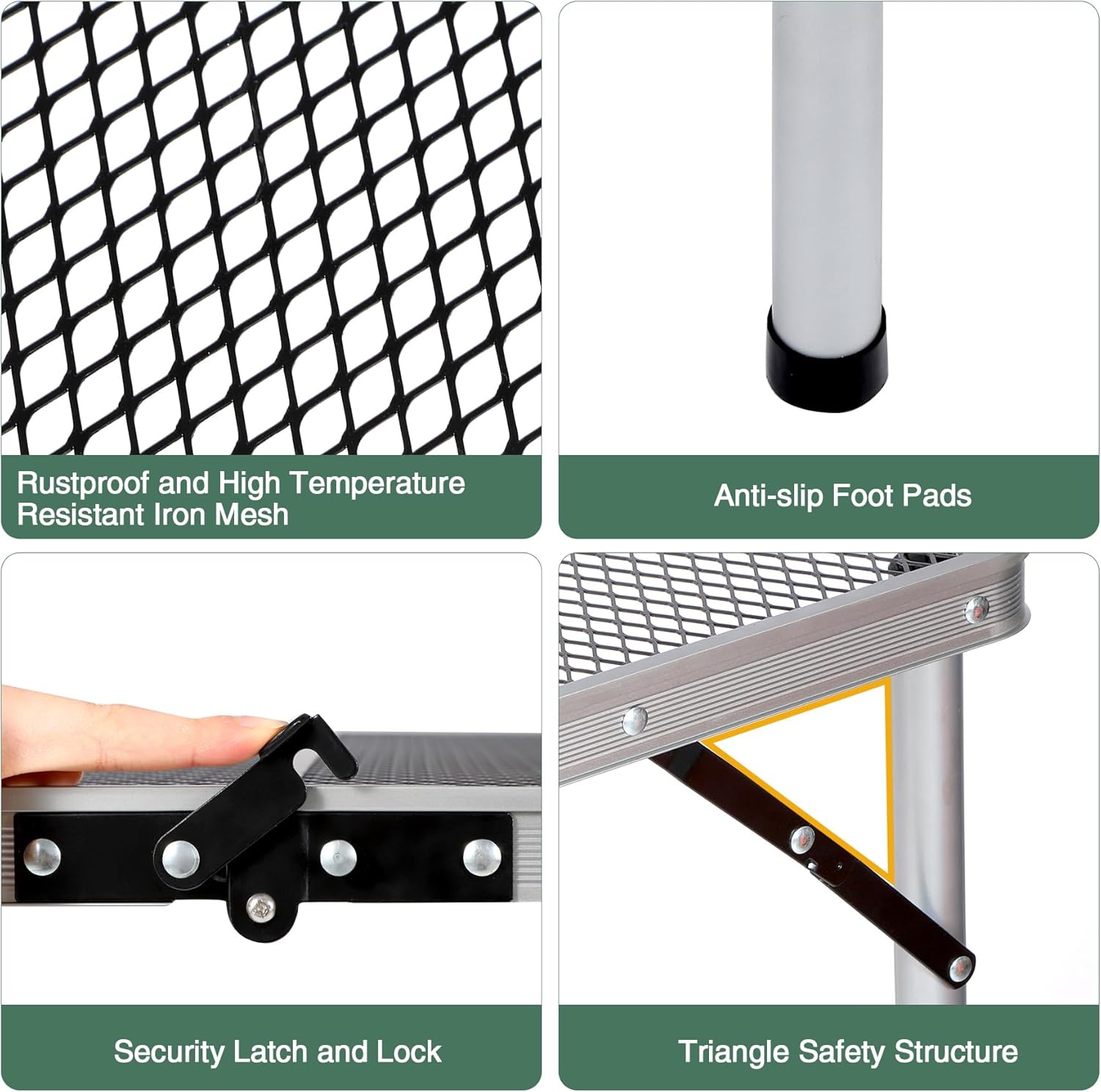 - High strength coated & heat resistant iron mesh (tabletop) and thicker aluminum alloy frame (diameter 25mm). X-shape side support and secure latch to ensure stablity.