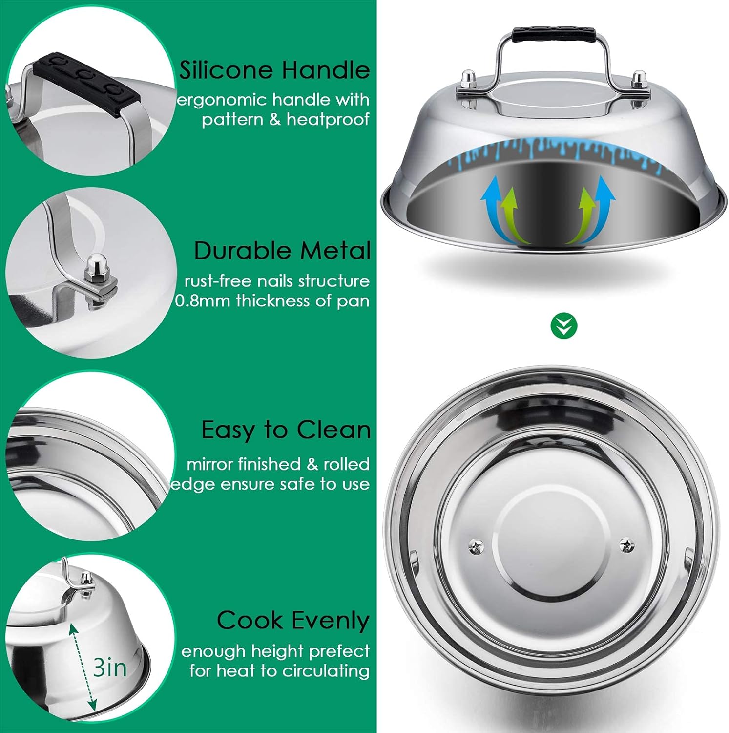 - MULTI FUNCTIONAL - Griddle spatula can move large amounts of food quickly, Scraper & chopper can dice food and scrape griddles clean, Egg rings can shape your eggs in round or heart that is more delicate, Basting cover helps to reduce cooking time and splatter, Press with grooves can effectively make food heated evenly, Storage bag for saving space, Meet most daily cooking needs