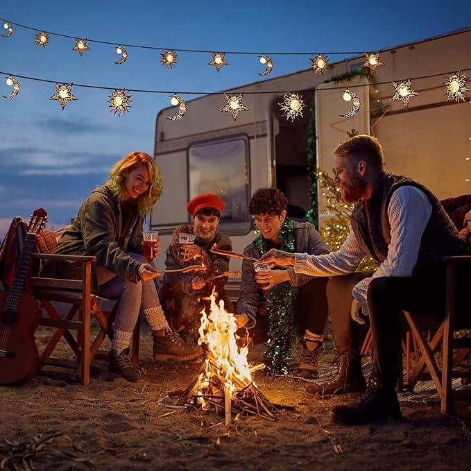 - 【Unique String Lights Designed Concept】Exclusive Copyright, Intellectual Property Protection. These classic 9 sun moon star pieces solar string light size: 6.5ft lead cable and Length between 2 star(3.9inch) .Two modes to choose: can be switched into flashing or steady mode.
