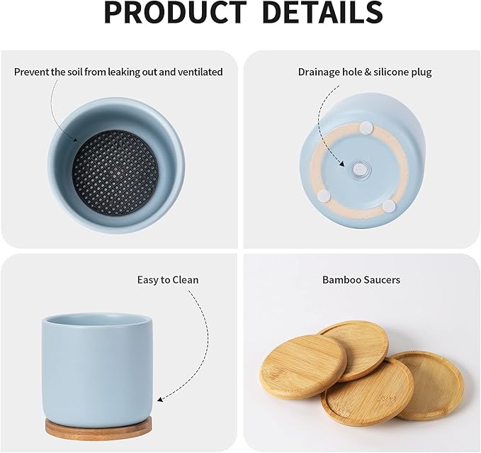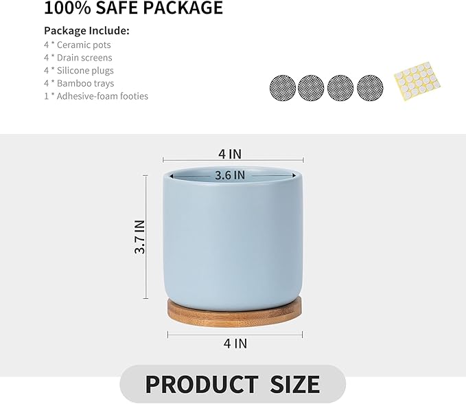 - Planter Size - The planter pot measuring in 4''(width) x 3.7''(height). Attached 4 saucers, 4 round bonsai bottom grid mats. (Plants not included).