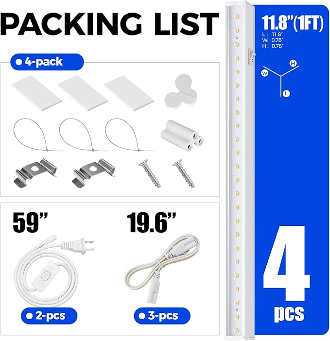 - What You Get: 4 x Barrina T5 Grow Lights, 2 x Power Cords with ON/OFF Switch, 4 x Connecting Cords(20''), 4 x Small Connectors, 8 x Installation Clips, 12 x Double-sided Tapes, 12 x Cable Ties