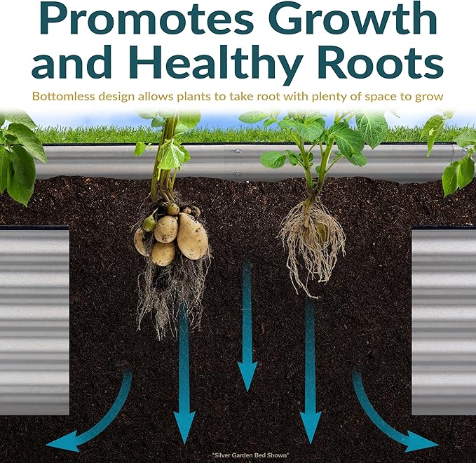 - PROMOTE HEALTHY ROOTS: Metal raised garden beds are ideal for encouraging good root development and growth for your vegetables, fruits, flowers, and herbs. The open-bottom design prevents waterlogging and ensures optimal soil moisture levels. Say goodbye to soggy roots and hello to thriving, healthy plants.