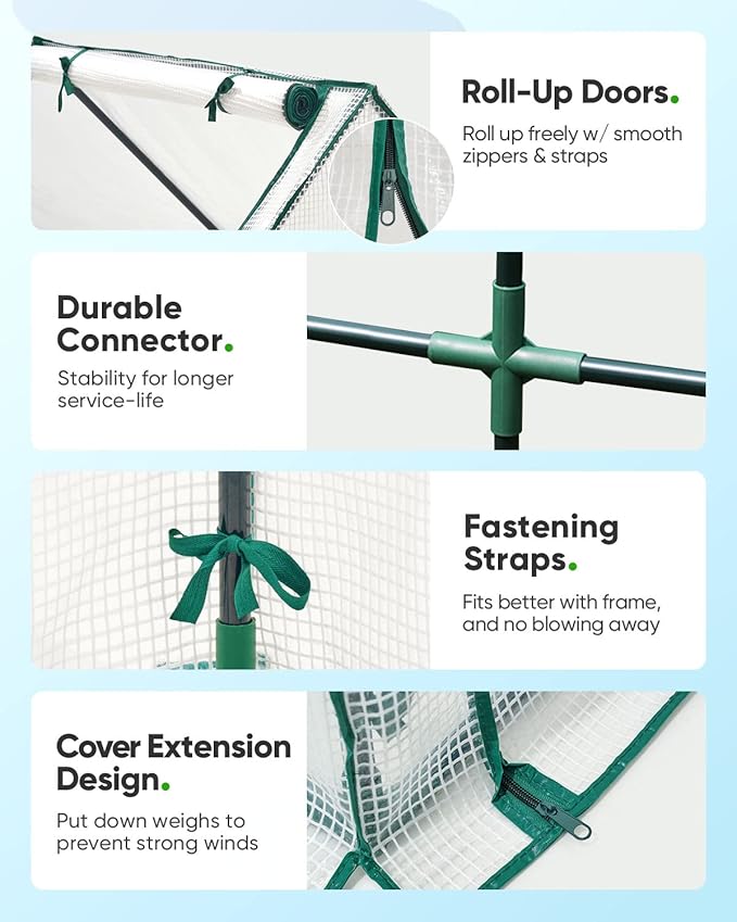 - ITEM EXACTLY MATCH THE DESCRIPTION - Steel Framework(Heavy-duty powder coated)+Transparent PE cover(UV-protected, waterproof, reinforced). The given guy ropes can make cover & frame combined better). P.S. 50 Pcs white T-Type name tags to mark and recognize your plant easily.