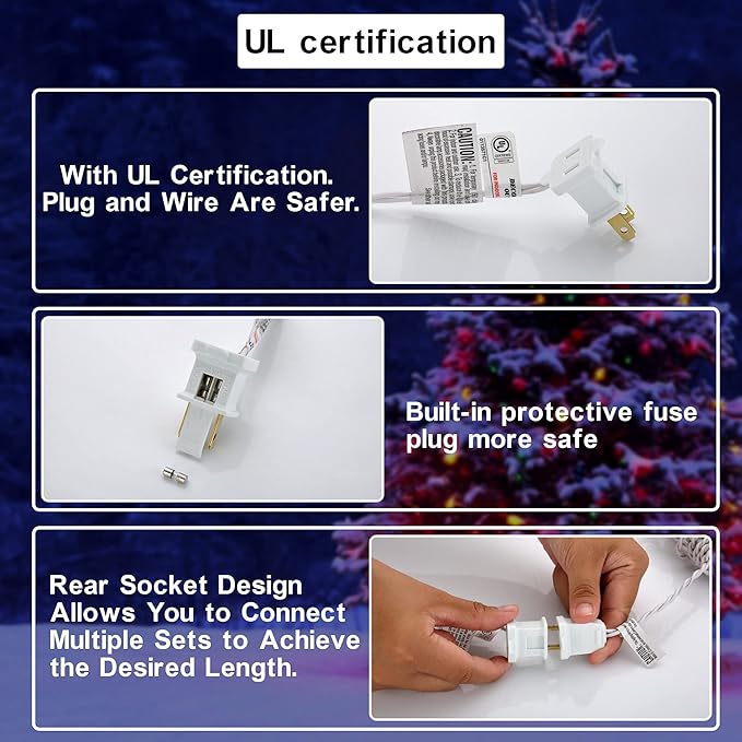 - 【Safe & Connectable】UL listed lights. Each light set comes with end-to-end plug and stackable plug to allow you connect multi sets to expand up desired length. Premium material ensures the Christmas lights can illuminate under a rainy, snowy day.